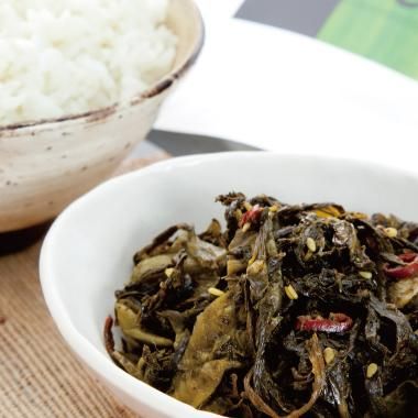 九州名物の辛子高菜に八女玉露の葉をたっぷりいれました。